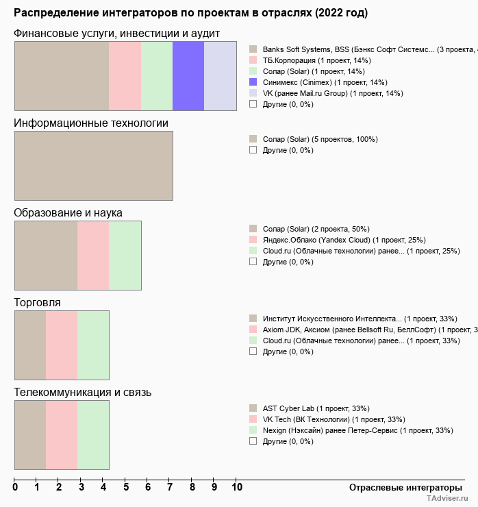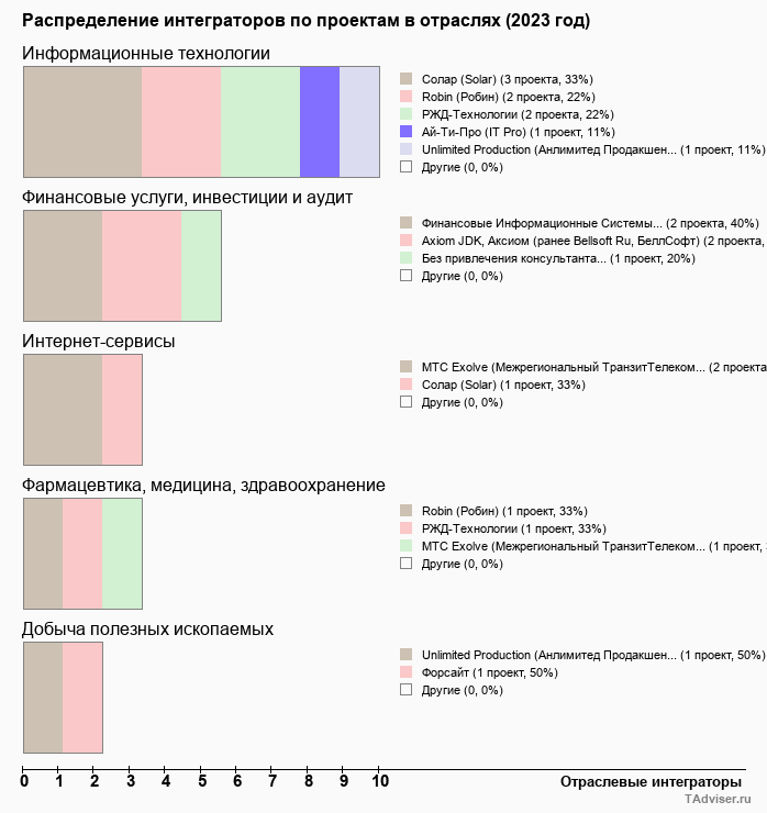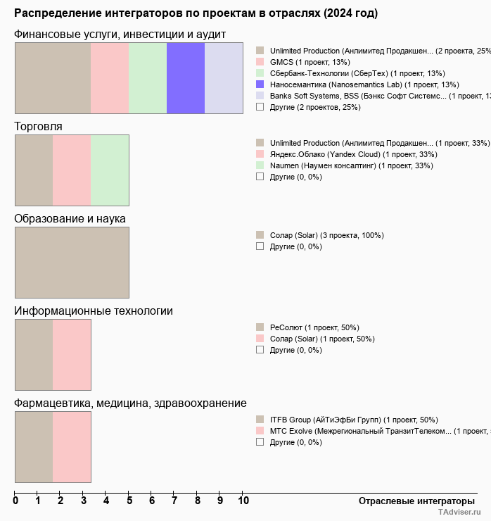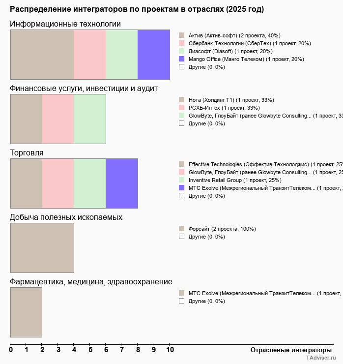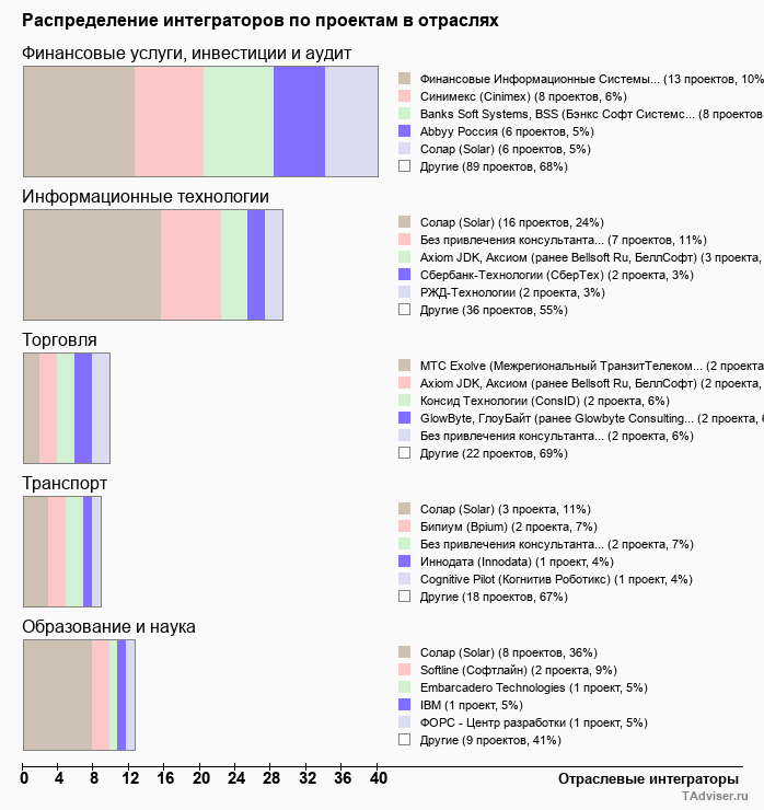 Отраслевое распределение по количеству проектов внедрений
