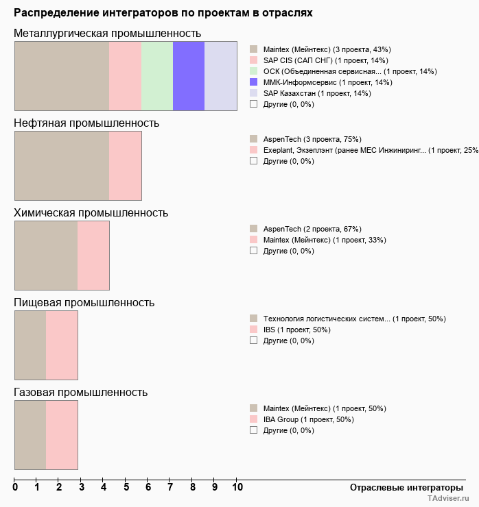Отраслевое распределение по количеству проектов внедрений