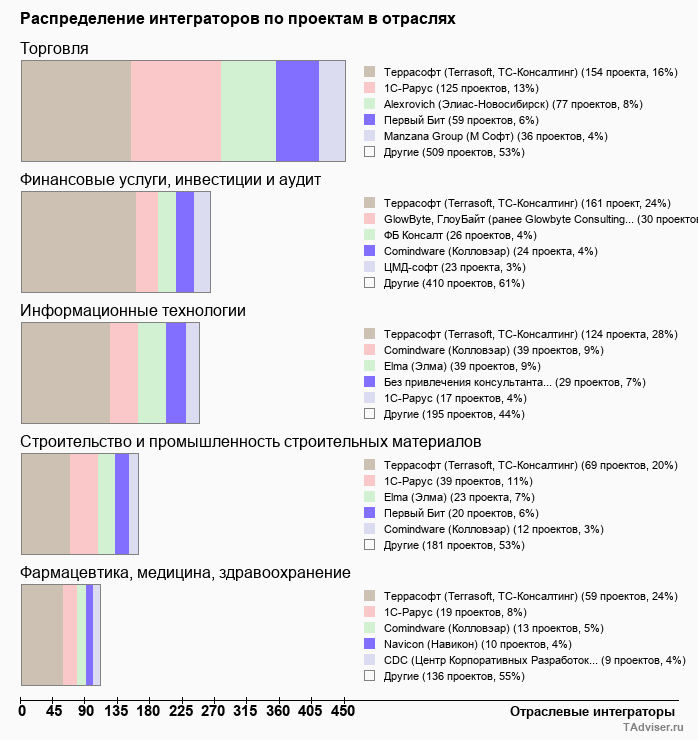 Согласно информации о проектах, содержащейся в базе TAdviser, за 2023-2025 гг. CRM-системы чаще всего внедрялись в торговле, в сфере финансовых услуг, в строительстве, ИТ и здравоохранении. На долю этих отраслей приходится 51% от всех реализованных проектов, известных TAdviser.