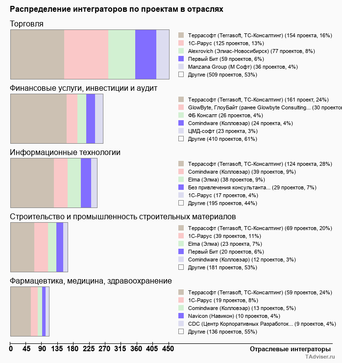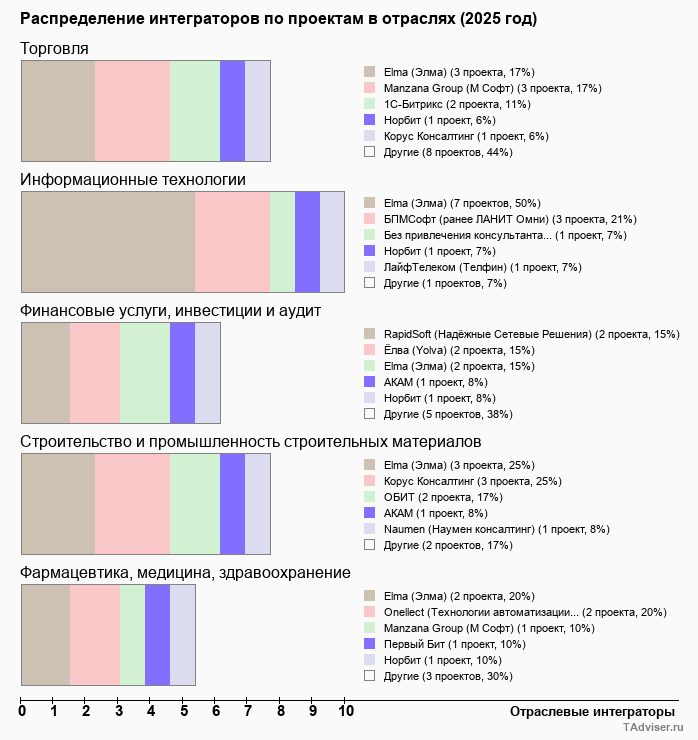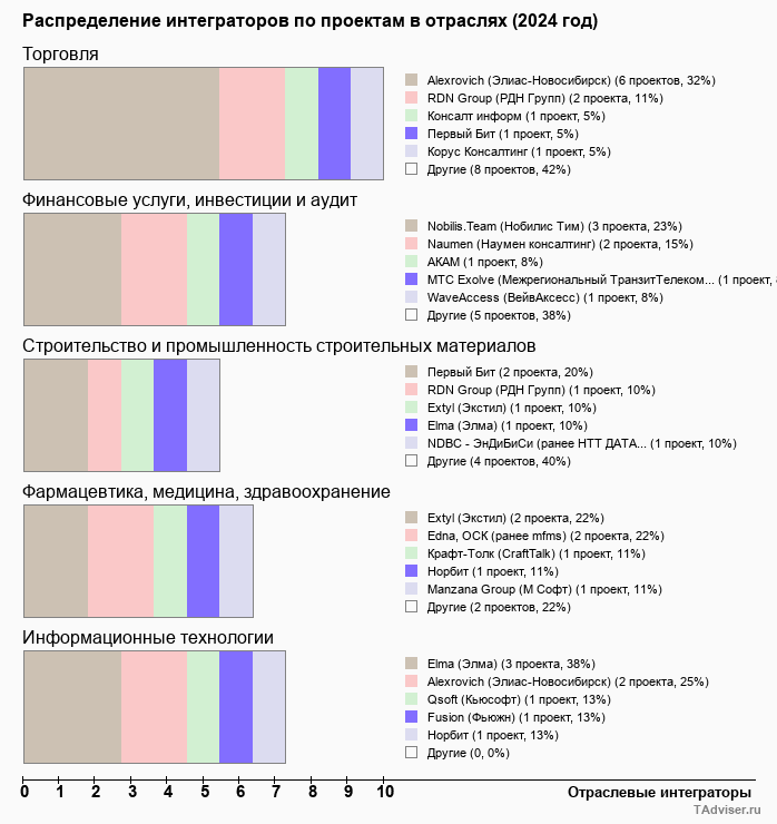 Отраслевое распределение по количеству проектов внедрений